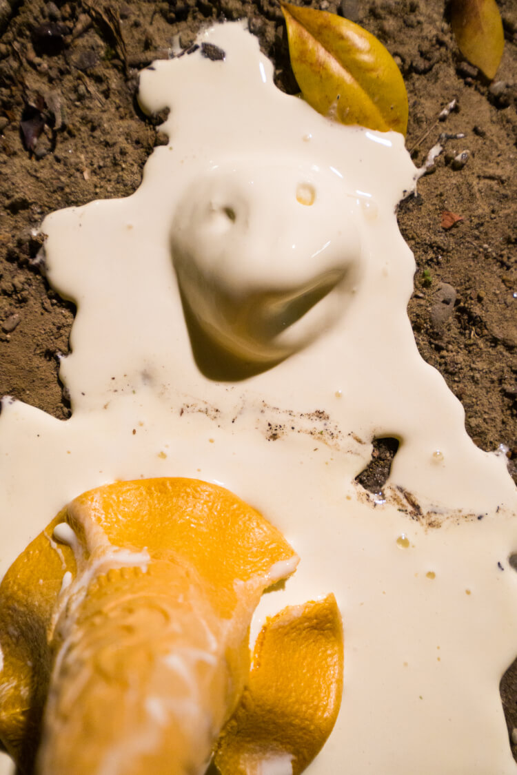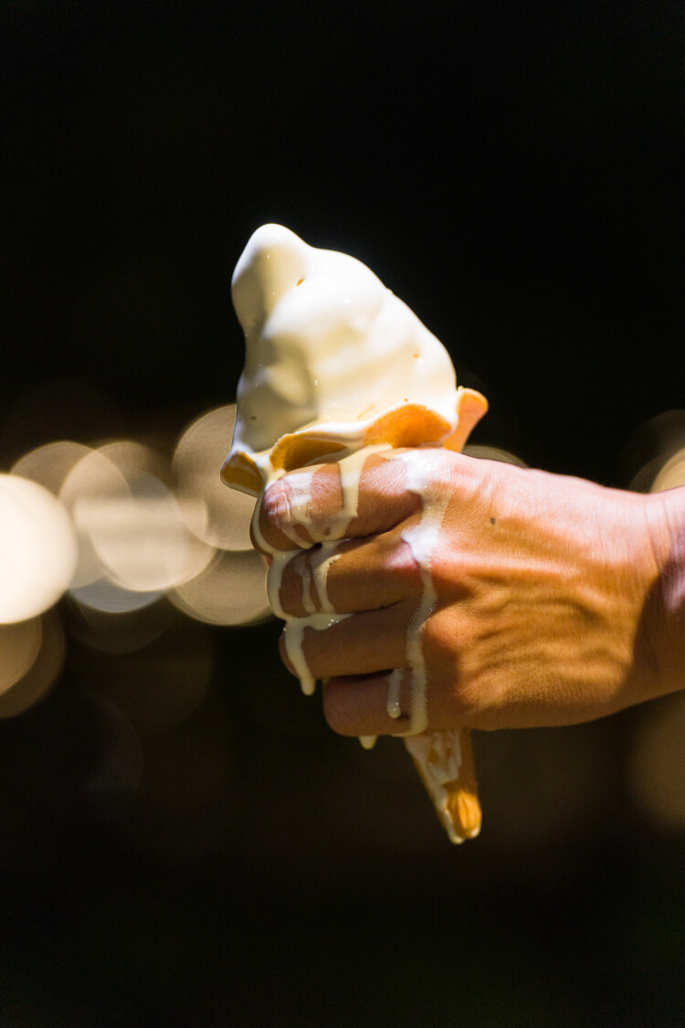 由於比賽橫跨一整晚,對於我們這種中年大叔來說,熬夜不睡覺實在太吃不消了。領到下一關題目後,在超商門口看見有人帶著霜淇淋走出來,累癱了的我們也好想吃,突然閃出了能很快拍完且有趣的點子,我們買了幾支霜淇淋,用霜淇淋的融化隱喻凡人的一生,在時間的一分一秒消逝過程中體驗生命的無常變化。其實,霜淇淋被拍攝前還被我們吃了幾口(笑)。
