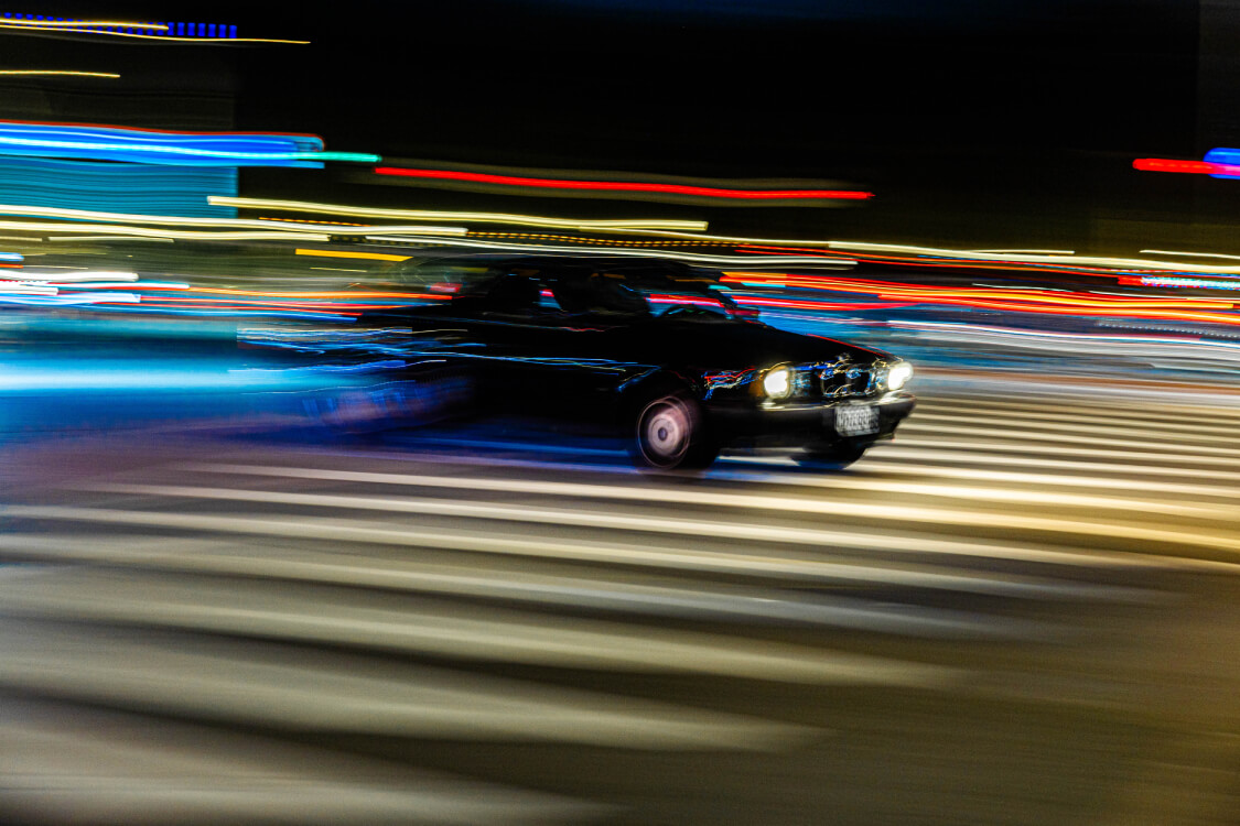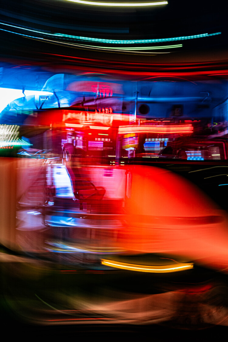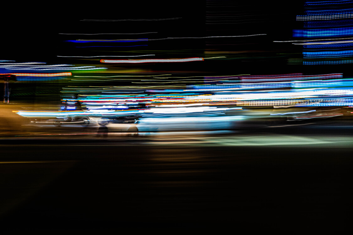 霓虹與車燈彼此追逐,在夜晚畫出時間的線條。