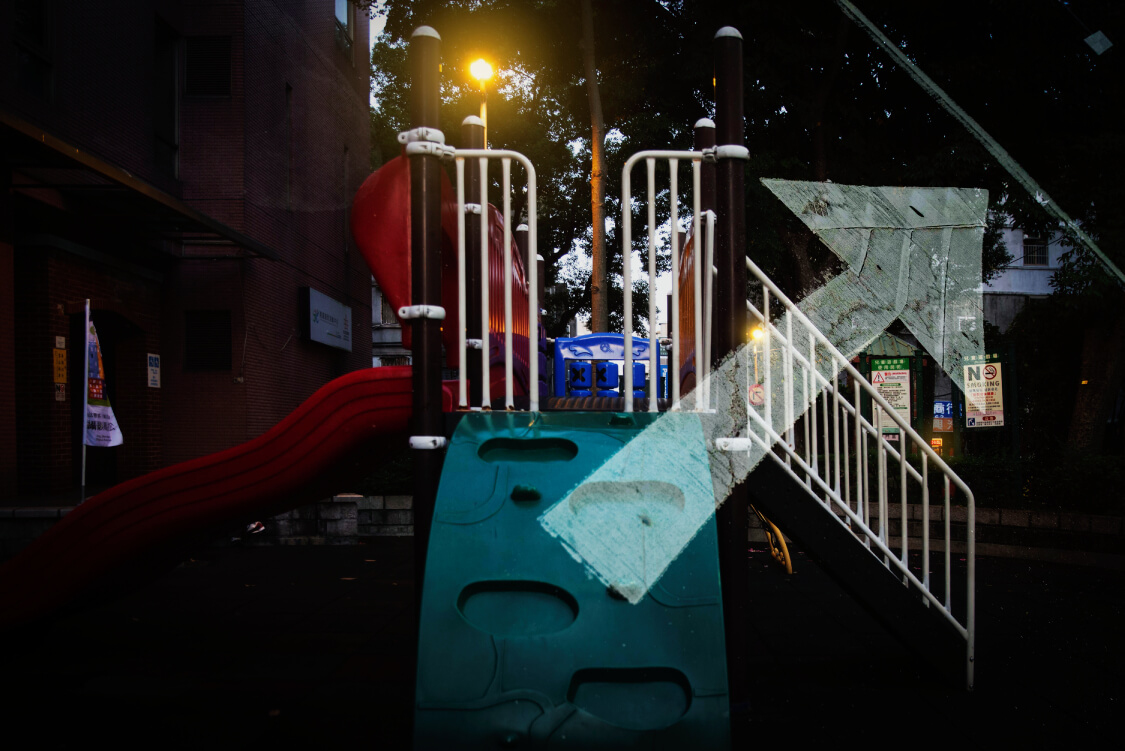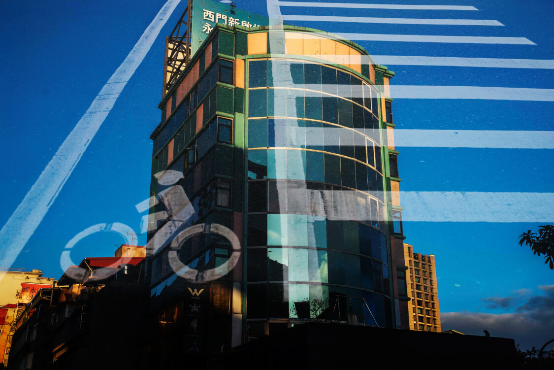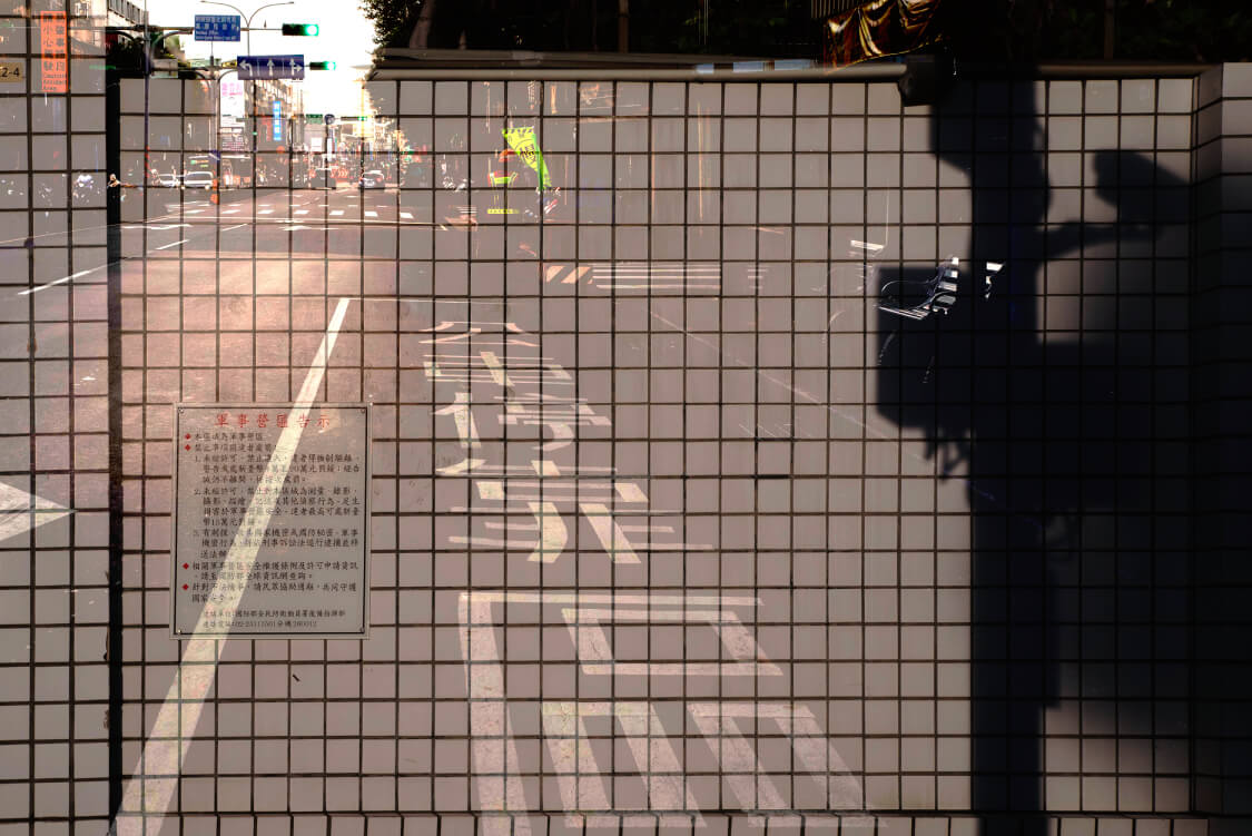 以重複曝光手法,結合日夜交替的光影,將斑馬線、方向箭頭等街道符號疊印在城市場景之上。透過時空的交疊,呈現日夜之間的過渡,既清醒又沉睡、既前進又停滯。這些疊影構成介於兩個時空的界限,讓熟悉的街景在矛盾與重複中浮現新的意義。