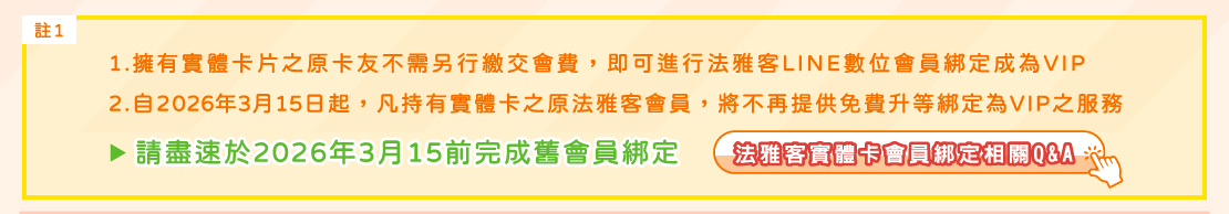- 2023/3/14前擁有實體卡片之原會員不需另行繳交會費即可進行法雅客LINE數位會員綁定成為VIP,未綁定LINE數位會員將無法享有點數累積、滿點禮券兌換等VIP會員權益。自2026年3月15日起,凡持有實體卡之原法雅客會員,將不再提供免費升等綁定為VIP之服務,請盡速於2026年3月15前完成舊會員綁定。尚未完成綁定系統將自動降等為「法雅客Friend」會員身份。若欲恢復VIP資格,需重新繳交入會手續費100元,並於次日升等為VIP享有會員專屬優惠與點數累積權益。
